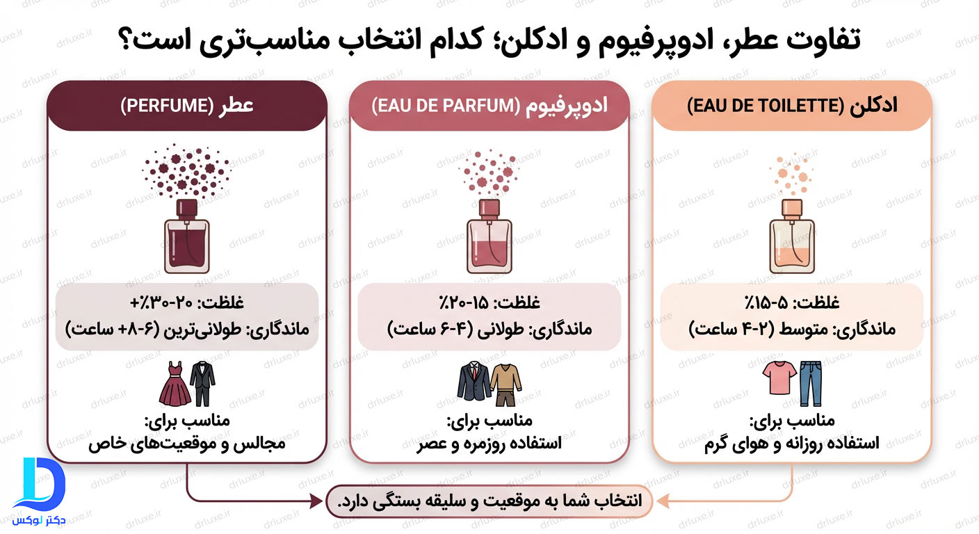 شناخت تفاوت عطر، ادوپرفیوم و ادکلن به شما کمک میکند انتخاب آگاهانهتری داشته باشید و بدانید چه رایحهای برای سبک زندگی، سلیقه و زمان استفاده شما مناسبتر است. اگر به دنبال ماندگاری بالا و رایحهای شاخص هستید، عطر انتخاب بهتری خواهد بود؛ اما اگر سبکی، طراوت و استفاده مکرر در طول روز برایتان اهمیت دارد، ادکلن یا ادوپرفیوم گزینهای کاربردیتر و اقتصادیتر محسوب میشوند.